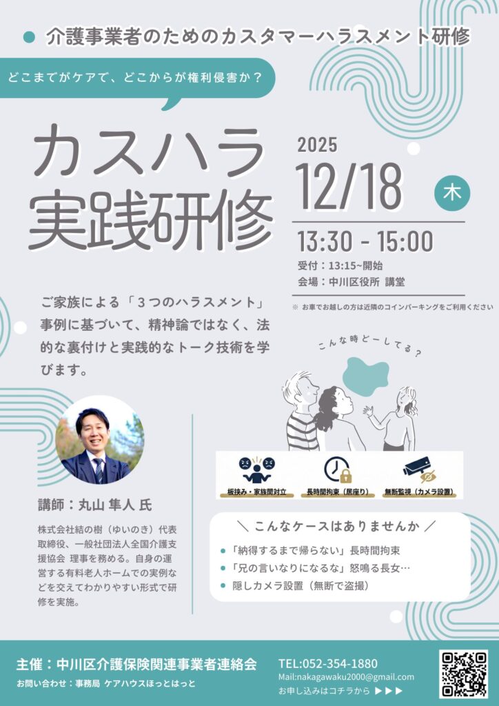 去る2025年12月18日(木)、中川区役所講堂にて、当連絡会主催の「介護事業者のためのカスタマーハラスメント実践研修」を開催いたしました。当日は多くの事業者様にご参加いただき、盛況のうちに終了いたしましたことをご報告申し上げます。